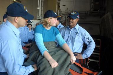 | Keywords: US Navy 071218-N-2959L-052 Laura Montero, the 14-year-old girl who was evacuated from the Princess Dawn cruise ship to the nuclear-powered aircraft carrier USS Ronald Reagan (CVN 76) when her appendix burst, says goodbye to Sai.jpg en SAN DIEGO Dec 18 2007 Laura Montero the 14-year-old girl who was evacuated from the Princess Dawn cruise ship to the nuclear-powered aircraft carrier USS Ronald Reagan CVN 76 when her appendix burst says goodbye to Sailors as the ship arrives in homeport of San Diego U S Navy photo by Mass Communication Specialist 2nd Class Dominique M Lasco Released 2007-12-18 071218-N-2959L-052 Navy http //www navy mil/view_image asp id 54003 U S Navy photo by Mass Communication Specialist 2nd Class Dominique M Lasco PD-USGov-Military-Navy Naval Base San Diego in the 2000s Aboard USS Ronald Reagan CVN-76 14-year-old human females |
