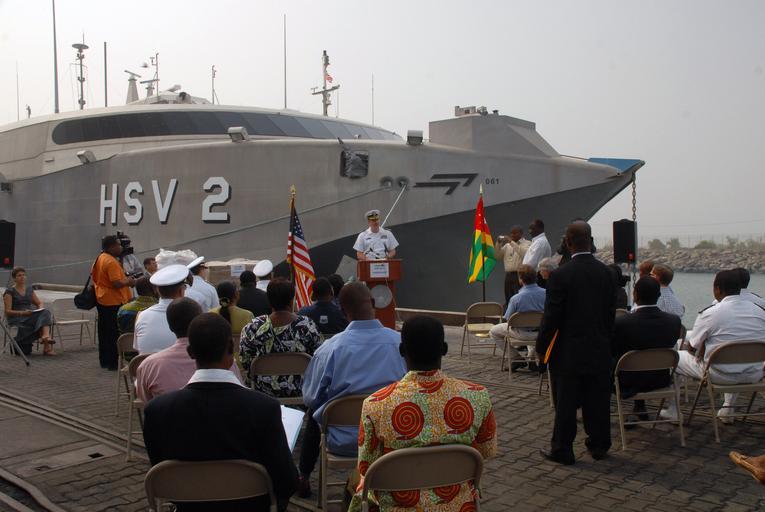 | Keywords: US Navy 080129-N-0193M-081 Cmdr. Charles Rock, commanding officer aboard the high speed vessel (HSV) 2 Swift, explains how Africa Partnership Station (APS) donated 107,000 meals to malnourished children through Project Handclas.jpg en LOME Togo Jan 29 2008 Cmdr Charles Rock commanding officer aboard the high speed vessel HSV 2 Swift explains how Africa Partnership Station APS donated 107 000 meals to malnourished children through Project Handclasp APS volunteers and members of Project Handclasp also donated toys and hygiene supplies to the children During the deployment APS will donate more than 150 pallets of food supplements medical supplies and hygiene products those in need in West and Central Africa U S Navy photo by Mass Communication Specialist 2nd Class Elizabeth Merriam Released 2008-01-29 080129-N-0193M-081 Navy http //www navy mil/view_image asp id 54977 U S Navy photo by Mass Communication Specialist 2nd Class Elizabeth Merriam PD-USGov-Military-Navy United States Navy in Lomé Exterior of HSV-2 Swift Coasts of Togo Africa Partnership Station 2008 Project Handclasp United States Navy |