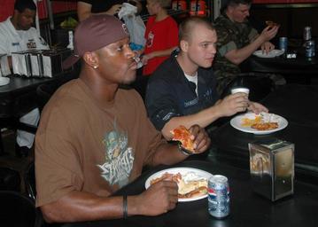 Keywords: US Navy 080203-N-7310D-005 San Diego Chargers wide receiver Kassim Osgood eats pizza with Sailors on the mess deck aboard the Pearl Harbor-based Ticonderoga-class guided-missile cruiser USS Chosin (CG 65).jpg en PEARL HARBOR Hawaii Feb 3 2008 San Diego Chargers wide receiver Kassim Osgood eats pizza with Sailors on the mess deck aboard the Pearl Harbor-based Ticonderoga-class guided-missile cruiser USS Chosin CG 65 during a visit aboard the ship to watch Super Bowl XLII with the crew U S Navy photo by Mass Communication Specialist 3rd Class David N Dexter Released 2008-02-03 080203-N-7310D-005 Navy http //www navy mil/view_image asp id 55021 U S Navy photo by Mass Communication Specialist 3rd Class David N Dexter PD-USGov-Military-Navy 2008 in Pearl Harbor USS Chosin CG-65 at Pearl Harbor Images from US Navy location Pearl Harbor Hawaii Aboard USS Chosin CG-65 |