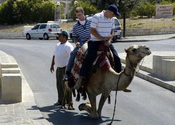 | Keywords: US Navy 080618-N-3316L-021 Boatswain's Mate 3rd Class Jonathan Lee and Seaman William Whale finish up a camel ride in Jerusalem during a MWR-sponsored tour of the Holy Land, part of a port visit by the amphibious transport dock.jpg  en JERUSALEM June 18 2008 Boatswain's Mate 3rd Class Jonathan Lee and Seaman William Whale finish up a camel ride in Jerusalem during a MWR-sponsored tour of the Holy Land part of a port visit by the amphibious transport dock ship USS Nashville LPD 13 to Haifa Nashville is a part of the Nassau Strike Group operating in the 6th Fleet area of responsibility supporting maritime security operations and theater security cooperation efforts U S Navy photo by Mass Communication Specialist 1st Class Charles L Ludwig Released 2008-06-18 080618-N-3316L-021 Navy http //www navy mil/view_image asp id 60479 U S Navy photo by Mass Communication Specialist 1st Class Charles L Ludwig PD-USGov-Military-Navy Images from US Navy location JERUSALEM Israel Camel riding Taken with Nikon D100 Camels in Israel 7 Arches hotel Jerusalem |