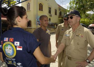 Keywords: US Navy 080627-N-0209M-005 ice Adm. Doug Crowder, commander, U.S. 7th Fleet, shakes hands with Air Force Senior Airman Arianne J. Sanchez during a tour of the medical civic action program site.jpg en NHA TRANG Vietnam June 27 2008 Vice Adm Doug Crowder commander U S 7th Fleet shakes hands with Air Force Senior Airman Arianne J Sanchez during a tour of the medical civic action program site at the Dien Khanh Primary School Crowder interacted with local patients and spoke with the crew of the Military Sealift Command hospital ship USNS Mercy T-AH 19 The Pacific Partnership deployment to Vietnam continues to improve bilateral relations between the U S and Vietnam demonstrating our continued commitment to work together to address mutual issues and concerns This mission involves partnerships with the armed forces of Vietnam Vietnamese health care professionals and local government officials U S Navy photo by Mass Communication Specialist 3rd Class Joshua Martin Released 2008-06-27 080627-N-0209M-005 Navy http //www navy mil/view_image asp id 60747 U S Navy photo by Mass Communication Specialist 3rd Class Joshua Martin PD-USGov-Military-Navy Health in Nha Trang Aboard USNS Mercy T-AH-19 William Douglas Crowder Handshakes involving the military |