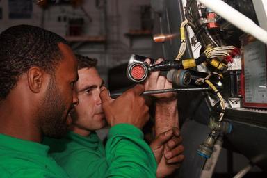 | Keywords: US Navy 080629-N-7446H-041 Aviation Electrician's Mate 3rd Class Garrett Atkinson, background, from Denver, Colo., holds a flashlight as Aviation Electrician's Mate 2nd Class Glen Thibodeaux, from Houston, installs an emergency.jpg en PACIFIC OCEAN June 29 2008 Aviation Electrician's Mate 3rd Class Garrett Atkinson background from Denver Colo holds a flashlight as Aviation Electrician's Mate 2nd Class Glen Thibodeaux from Houston installs an emergency battery in a Strike Fighter Squadron 195 F/A-18C Hornet in the hangar bay aboard the aircraft carrier USS Kitty Hawk CV 63 U S Navy photo by Mass Communication Specialist 2nd Class Derek J Hurder Released 2008-06-29 080629-N-7446H-041 Navy http //www navy mil/view_image asp id 60936 U S Navy photo by Mass Communication Specialist 2nd Class Derek J Hurder PD-USGov-Military-Navy Aboard USS Kitty Hawk CV-63 Aviation Electrician's Mate |