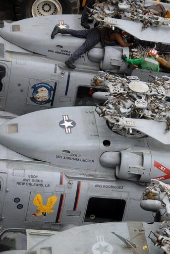 | Keywords: US Navy 080709-N-1281H-057 Plane captains and maintenance personnel assigned to Helicopter Anti-Submarine Squadron Light (HSL) 47 perform pre-flight maintenance on an SH-60B Seahawk aboard the Nimitz-class aircraft carrier USS.jpg en NORTH ARABIAN SEA July 9 2008 Plane captains and maintenance personnel assigned to Helicopter Anti-Submarine Squadron Light HSL 47 perform pre-flight maintenance on an SH-60B Seahawk aboard the Nimitz-class aircraft carrier USS Abraham Lincoln CVN 72 Lincoln is deployed to the U S 5th Fleet area of responsibility supporting maritime security operations U S Navy photo by Aviation Electronics Technician Airman Ashley Houp Released 2008-07-09 080709-N-1281H-057 Navy http //www navy mil/view_image asp id 61196 U S Navy photo by Aviation Electronics Technician Airman Ashley Houp PD-USGov-Military-Navy Aboard USS Abraham Lincoln CVN-72 |