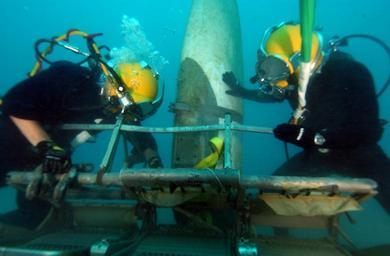 Keywords: US Navy 080717-N-1974P-033 A U.S. Navy diver and an Australian Defense Forces diver secure wreckage to a shipboard crane during underwater salvage training near Pearl Harbor.jpg en PEARL HARBOR Hawaii July 17 2008 A U S Navy diver assigned to Mobile Underwater Diving Salvage Unit MUDSU 1 and an Australian Defense Forces assigned to diver Clearance Diving Team AUSCDT 4 secure wreckage to a shipboard crane during underwater salvage training near Pearl Harbor This surface air-supplied dive is supported by the Military Sealift Command rescue and salvage ship USNS Salvor T-ARS 52 during the Rim of The Pacific 2008 exercise U S Navy photo by Mass Communication Specialist 2nd Class Walter Pels Released 2008-07-17 080717-N-1974P-033 Navy http //www navy mil/view_image asp id 61544 U S Navy photo PD-USGov-Military-Navy 2008 in Pearl Harbor Images from US Navy location Pearl Harbor Hawaii Underwater photographs of surface supplied divers Clearance Diving Team RAN Underwater salvage |