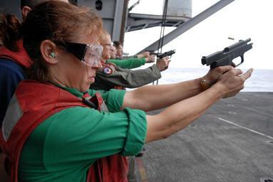 Keywords: US Navy 080824-N-4005H-367 Aviation Structural Mechanic 3rd Class Erika Mata fires a 9 mm pistol at a target during a small-arms weapons qualifying exercise aboard the Nimitz-class aircraft carrier USS Ronald Reagan (CVN 76).jpg en INDIAN OCEAN Aug 24 2008 Aviation Structural Mechanic 3rd Class Erika Mata assigned to the Black Knights of Helicopter Anti-Submarine Squadron HS 4 fires a 9 mm pistol at a target during a small-arms weapons qualifying exercise on aircraft elevator 4 aboard the Nimitz-class aircraft carrier USS Ronald Reagan CVN 76 The weapons exercise was used to teach Sailors proper gun handling techniques The Ronald Reagan Carrier Strike Group is on a routine deployment in the U S 7th Fleet area of responsibility U S Navy photo by Mass Communication Specialist 3rd Class Aaron Holt/Released 2008-08-24 080824-N-4005H-367 Navy http //www navy mil/view_image asp id 62987 U S Navy photo by Mass Communication Specialist 3rd Class Aaron Holt PD-USGov-Military-Navy Aircraft elevators of USS Ronald Reagan CVN-76 SIG Sauer P228 Females with firearms Cartridge ejection Pistol shooting Firearms training on USS Ronald Reagan CVN-76 |