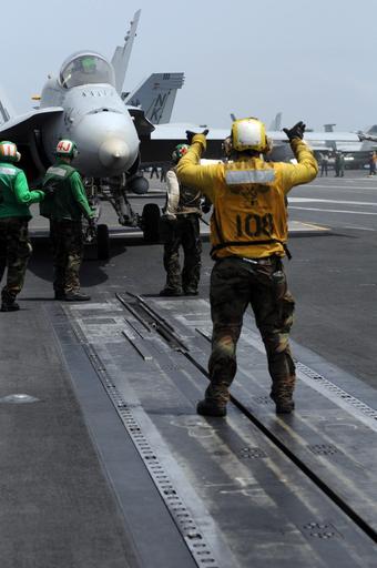 | Keywords: US Navy 080828-N-3659B-038 An aviation boatswain's mate (handling) gives the hand signal for the pilot of an F-A-18C Hornet assigned VFA-25 to taxi forward onto catapult 2 on the flight deck of USS Ronald Reagan (CVN 76).jpg en INDIAN OCEAN Aug 28 2008 An aviation boatswain's mate handling gives the hand signal for the pilot of an F/A-18C Hornet assigned to the Fist of the Fleet of Strike Fighter Squadron VFA 25 to taxi forward onto catapult 2 on the flight deck of the Nimitz-class aircraft carrier USS Ronald Reagan CVN 76 Ronald Reagan is deployed in the U S 5th Fleet area of responsibility and is focused on reassuring regional partners of the United States' commitment to security which promotes stability and global prosperity U S Navy photo by Mass Communication Specialist 2nd Class Joseph M Buliavac/Released 2008-08-28 080828-N-3659B-038 Navy http //www navy mil/view_image asp id 63353 U S Navy photo by Mass Communication Specialist 2nd Class Joseph M Buliavac PD-USGov-Military-Navy Aviation Boatswain's Mates Handlers Catapults of USS Ronald Reagan CVN-76 Strike Fighter Squadron 25 United States Navy F/A-18 Hornet launches from USS Ronald Reagan CVN-76 |