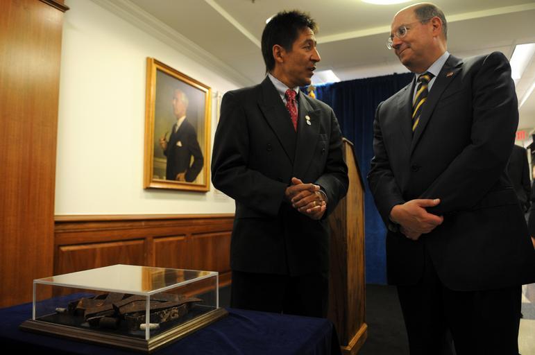 Keywords: US Navy 080911-N-5549O-063 Secretary of the Navy (SECNAV) The Honorable Dr. Donald C. Winter speaks with Arlington County Board Chairman Water Tejada during a ceremonial presentation of Pentagon steel.jpg en WASHINGTON Sept 11 2008 Secretary of the Navy SECNAV The Honorable Dr Donald C Winter speaks with Arlington County Board Chairman Walter Tejada during a ceremonial presentation of Pentagon steel This steel taken from the Pentagon after the Sept 11 2001 terrorist attack will be displayed aboard the amphibious transport dock ship USS Arlington LPD 24 once commissioned U S Navy photo by Mass Communication Specialist 2nd Class Kevin S O'Brien/Released 2008-09-11 080911-N-5549O-063 Navy http //www navy mil/view_image asp id 63875 U S Navy photo by Mass Communication Specialist 2nd Class Kevin S O'Brien PD-USGov-Military-Navy Commissioning of USS Arlington LPD-24 Donald C Winter Interior of The Pentagon Seventh anniversary of the September 11 2001 attacks J Walter Tejada |
