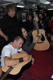 Keywords: US Navy 080924-N-4005H-148 Scott Stapp signs a guitar for a Sailor.jpg en GULF OF OMAN Sept 24 2008 Scott Stapp former lead singer of the band Creed signs a guitar for a Sailor during an autograph session on the mess decks of the Nimitz-class aircraft carrier USS Ronald Reagan CVN 76 Stapp and his band put on a concert and signed autographs for the Sailors during an event sponsored by Navy Entertainment Ronald Reagan is deployed to the U S 5th Fleet area of responsibility U S Navy photo by Mass Communication Specialist 3rd Class Aaron Holt /Released 2008-09-24 080924-N-4005H-148 Navy http //www navy mil/view_image asp id 64603 U S Navy photo by Mass Communication Specialist 3rd Class Aaron Holt PD-USGov-Military-Navy Guests aboard USS Ronald Reagan CVN-76 Scott Stapp Mess decks of USS Ronald Reagan CVN-76 Steel-string acoustic guitars |