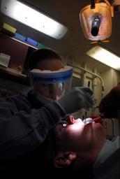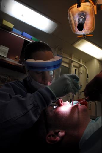| Keywords: US Navy 081011-N-9610C-007 ospital Corpsman Dami-anne Boykin gives Aviation Electronics Technician 3rd Class Michael Morgan his yearly tooth cleaning.jpg  en PACIFIC OCEAN Oct 11 2008 Hospital Corpsman Dami-anne Boykin from Carrollton Ga gives Aviation Electronics Technician 3rd Class Michael Morgan from Hart Mich his yearly tooth cleaning in health services department's dental office aboard the Nimitz-class aircraft carrier USS John C Stennis CVN 74 Stennis is conducting pre-deployment exercises off the coast of Southern California U S Navy photo by Mass Communication Specialist 3rd Class Dmitry Chepusov/Released 2008-10-11 081011-N-9610C-007 Navy http //www navy mil/view_image asp id 65282 U S Navy photo by Mass Communication Specialist 3rd Class Dmitry Chepusov PD-USGov-Military-Navy Aboard USS John C Stennis CVN-74 Hospital Corpsman Aviation Electronics Technician Face shields |