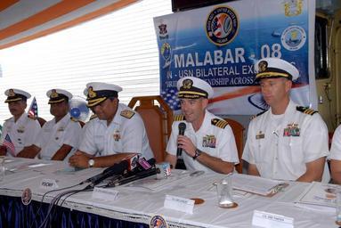 | Keywords: US Navy 081018-N-1635S-008 Capt. John P. Nolan, commanding officer of the guided-missile cruiser USS Chancellorsville (CG 62), speaks alongside Rear Adm. Anil Chopra, flag officer in command of the Indian Navy's Western Fleet,.jpg  en INDIAN OCEAN Oct 18 2008 Capt John P Nolan commanding officer of the guided-missile cruiser USS Chancellorsville CG 62 speaks alongside Rear Adm Anil Chopra flag officer in command of the Indian Navy's Western Fleet during an Exercise Malabar 2008 press conference aboard the Indian Navy destroyer INS Mumbai D 62 in Goa India Exercise Malabar 08 is designed to enhance the cooperative security relationship between India and the United States and increase cooperation between the Indian and U S Navy U S Navy photo by Mass Communication Specialist 3rd Class Joshua Scott/Released 2008-10-18 081018-N-1635S-008 Navy http //www navy mil/view_image asp id 65546 U S Navy photo by Mass Communication Specialist 3rd Class Joshua Scott PD-USGov-Military-Navy Malabar 2008 Naval officers of the United States USS Chancellorsville CG-62 Admirals of India Anil Chopra admiral |