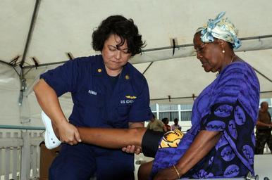 Keywords: US Navy 081027-N-5642P-131 Coast Guard Lt. Cmdr. Kimberly Roman gives a Trinidadian woman an exam.jpg en COUVA Trinidad and Tobago Oct 27 2008 Coast Guard Lt Cmdr Kimberly Roman a general physician embarked aboard the amphibious assault ship USS Kearsarge LHD 3 gives a Trinidadian woman an exam at a local health facility during the humanitarian/civic assistance mission Continuing Promise CP 2008 Kearsarge is the primary platform for the Caribbean phase of CP an equal-partnership mission involving the United States Canada the Netherlands Brazil Nicaragua Colombia Dominican Republic Trinidad and Tobago and Guyana U S Navy photo by Mass Communication Specialist 3rd Class William S Parker/Released 2008-10-27 081027-N-5642P-131 Navy http //www navy mil/view_image asp id 65890 U S Navy photo by Mass Communication Specialist 3rd Class William S Parker PD-USGov-Military-Navy Images from US Navy location COUVA Trinidad and Tobago |