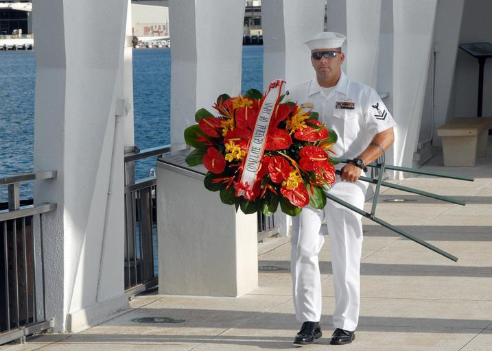 | Keywords: US Navy 081206-N-4512B-182 Boatswain's Mate 2nd Class Arthur Sacdana prepares a wreath for display during Pearl Harbor Day events.jpg en PEARL HARBOR Dec 6 2008 Boatswain's Mate 2nd Class Arthur Sacdana prepares a wreath donated by the Consulate General of Japan for display during upcoming Pearl Harbor Day events aboard the USS Arizona Memorial The wreaths serve as a tribute to service members killed during the Dec 7 1941 attack on Pearl Harbor The theme of this year's historic commemoration Pacific War Memories The Heroic Response to Pearl Harbor emphasized the brave efforts of those who fought at sea on land and in the air to turn the tide in the Pacific More than 2 000 guests and the general public joined service members Pearl Harbor survivors and their families and friends for the annual observance U S Navy photo by Mass Communication Specialist 3rd Class Jeremy S Brandt/Released 2008-12-06 081206-N-4512B-182 Navy http //www navy mil/view_image asp id 67202 U S Navy photo by Mass Communication Specialist 3rd Class Jeremy S Brandt PD-USGov-Military-Navy USS Arizona Memorial interior Boatswain's Mate United States Navy Memorial wreaths |