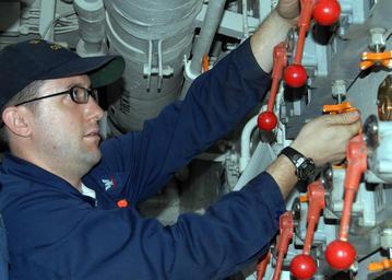 | Keywords: US Navy 090128-N-3666S-022 Gas Turbine System Technician 3rd Class Clayton Kraus tests a manual valve hydraulic control station aboard the Ticonderoga-class guided-missile cruiser USS Chosin (CG 65).jpg en PEARL HARBOR Jan 28 2009 Gas Turbine System Technician 3rd Class Clayton Kraus tests a manual valve hydraulic control station aboard the Ticonderoga-class guided-missile cruiser USS Chosin CG 65 Chosin recently participated in the first Commander Naval Surface Group Pacific Mid-Pacific Surface Combatant Group Sail supporting the Pacific Fleet Mid-Pacific Surface Combatant Operational Employment program The program calls for all Hawaii-based surface combatants to focus on the western Pacific Ocean by conducting intermediate and advanced training and scheduled deployments in the western Pacific Ocean U S Navy photo by Mass Communication Specialist 3rd Class Robert Stirrup/Released 2009-01-28 090128-N-3666S-022 Navy http //www navy mil/view_image asp id 68442 U S Navy photo by Mass Communication Specialist 3rd Class Robert Stirrup PD-USGov-Military-Navy Gas Turbine System Technicians 2009 in Pearl Harbor Images from US Navy location Pearl Harbor Hawaii Aboard USS Chosin CG-65 |