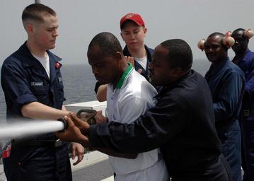 Keywords: US Navy 090213-N-1655H-020 Africa Partnership Station embarked trainees practice manning a fire hose aboard the amphibious transport dock ship USS Nashville (LPD 13) during damage control training.jpg en ATLANTIC OCEAN Feb 13 2009 Africa Partnership Station embarked trainees practice manning a fire hose aboard the amphibious transport dock ship USS Nashville LPD 13 during damage control training The west African sailors from Benin Ghana and Togo are embarked aboard Nashville for three weeks Nashville is deployed as part of Africa Partnership Station 2009 an international initiative developed by Naval Forces Europe and Naval Forces Africa which aims to work cooperatively with U S and international partners to enhance maritime safety and security for the continent of Africa U S Navy photo by Mass Communication Specialist 2nd Class David Holmes/Released 2009-02-13 090213-N-1655H-020 Navy http //www navy mil/view_image asp id 68801 U S Navy photo by Mass Communication Specialist 2nd Class David Holmes PD-USGov-Military-Navy Aboard USS Nashville LPD-13 Africa Partnership Station 2009 |