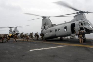 | Keywords: US Navy 090401-N-6552M-070 Marines from the 13th Marine Expeditionary Unit (13th MEU) embarked aboard the amphibious assault ship USS Boxer (LHD 4) board a CH-46 Sea Knight helicopter.jpg en GULF OF ADEN April 1 2009 Marines from the 13th Marine Expeditionary Unit 13th MEU embarked aboard the amphibious assault ship USS Boxer LHD 4 board a CH-46 Sea Knight helicopter to engage in readiness drills near the Horn of Africa Boxer is deployed as part of Boxer Amphibious Readiness group/13th MEU supporting maritime security operations in the U S 5th fleet area of responsibility U S Navy photo by Mass Communication Specialist 2nd Class Christopher Menzie/Released 2009-04-01 090401-N-6552M-070 Navy http //www navy mil/view_image asp id 70408 U S Navy photo by Mass Communication Specialist 2nd Class Christopher Menzie PD-USGov-Military-Navy Aboard USS Boxer LHD-4 CH-46 US Marine Corps |