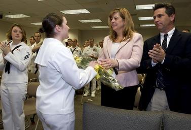 Keywords: US Navy 090415-N-5319A-008 Mass Communication Specialist Seaman Kathleen O'Keefe hands flowers to Katherine McRill, widow of Mass Communication Specialist 1st Class Bobby McRill, during a graduation ceremony at Defense Informat.jpg en FORT MEADE Md April 15 2009 Mass Communication Specialist Seaman Kathleen O'Keefe hands flowers to Katherine McRill widow of Mass Communication Specialist 1st Class Bobby McRill during a graduation ceremony at Defense Information School at Ft George G Meade O'Keefe is the first Defense Information School graduate to receive the Bobby McRill Award for outstanding performance at Defense Information School McRill was killed in combat in Iraq in 2007 and the McRill Award has been created in his honor to be presented to the Mass Communication Specialist who best displays the Navy's core values of honor courage and commitment U S Navy photo by Mass Communication Specialist 1st Class Brien Aho/Released 2009-04-15 090415-N-5319A-008 Navy http //www navy mil/view_image asp id 70603 U S Navy photo by Mass Communication Specialist 1st Class Brien Aho PD-USGov-Military-Navy Fort Meade Mass Communication Specialist |