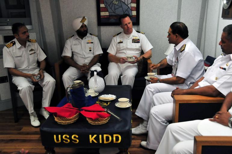 | Keywords: US Navy 090515-N-1488S-079 Commanding Officer, USS Kidd (DDG 100), Cmdr. Chuck Good, shares a cup of tea with Flag Officer Eastern Fleet, Indian Navy, Rear Adm. A.G. Thapliyal, during the International Maritime Defense Exhibiti.jpg  en SINGAPORE CITY Singapore May 14 2009 Commanding Officer USS Kidd DDG 100 Cmdr Chuck Good shares a cup of tea with Flag Officer Eastern Fleet Indian Navy Rear Adm A G Thapliyal during the International Maritime Defense Exhibition IMDEX Asia 2009 which is a biennial conference showcasing the latest in maritime defense technology Kidd is part of John C Stennis Carrier Strike Group and is in Singapore for a port visit as part of a scheduled six-month deployment to the western Pacific Ocean U S Navy photo by Ensign Alexis F Steele/Released 2009-05-14 090515-N-1488S-079 Navy http //www navy mil/view_image asp id 71621 U S Navy photo by Ensign Alexis F Steele PD-USGov-Military-Navy Naval ships of the United States in Singapore Aboard USS Kidd DDG-100  |