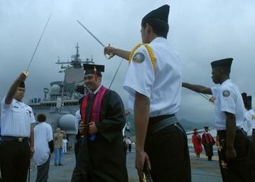 Keywords: US Navy 090606-N-9950J-080 Graduate Anthony Ryan walks through the E.J. King High School.jpg en SASEBO Japan June 6 2009 Graduate Anthony Ryan walks through the E J King High School Naval Junior Reserve Officer's Training Corps NROTC Honor Guard during the 2009 E J King High School graduation ceremony aboard the forward-deployed amphibious assault ship USS Essex LHD 2 Essex is commanded by Capt Brent Canady and is the lead ship of the only forward-deployed U S Expeditionary Strike Group and serves as the flagship for CTF 76 the Navy's only forward-deployed amphibious force commander Task Force 76 is headquartered at White Beach Naval Facility Okinawa Japan with a detachment in Sasebo Japan U S Navy photo by Mass Communication Specialist 2nd Class Greg Johnson/Released 2009-06-06 090606-N-9950J-080 Navy http //www navy mil/view_image asp id 72456 U S Navy photo by Mass Communication Specialist 2nd Class Greg Johnson PD-USGov-Military-Navy Sasebo Nagasaki Aboard USS Essex LHD-2 Naval Reserve Officers Training Corps |