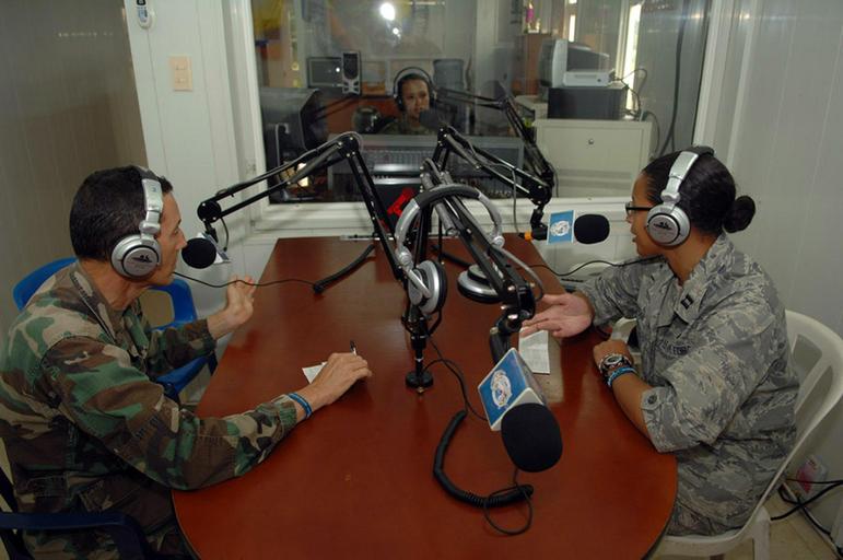 Keywords: US Navy 090611-F-1333S-002 Air Force Capt. Andrea Beltran and Air Force Maj. Efrain Delvalle was invited to the Colombian Military Radio Station to speak on behalf of all members of Continuing Promise 2009.jpg en TUMACO Colombia June 11 2009 Air Force Capt Andrea Beltran from the 71st Medical Support Squadron Vance AFB Okla and Air Force Maj Efrain Delvalle from Patrick AFB Fla was invited to the Colombian Military Radio Station to speak on behalf of all members of Continuing Promise 2009 CP09 combines U S military and interagency personnel non-governmental organizations civil service mariners academic and partner nations to provide medical dental veterinary and engineering services afloat and ashore alongside host nation personnel U S Air Force photo by Senior Airman Jessica Snow/Released 2009-06-11 090611-F-1333S-002 Navy http //www navy mil/view_image asp id 72658 U S Air Force photo by Senior Airman Jessica Snow PD-USGov-Military-Navy Images from US Navy location TUMACO Colombia |