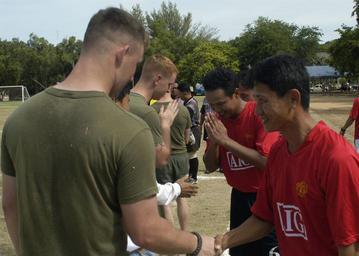 | Keywords: US Navy 090712-N-6770T-183 U.S. Marines embarked aboard the dock landing ship USS Harpers Ferry (LSD 49) greet opposing Thai soccer players during a sports day for Cooperation Readiness Afloat and Training (CARAT) Thailand 2009.jpg en SATTAHIP Thailand July 12 2009 U S Marines embarked aboard the dock landing ship USS Harpers Ferry LSD 49 greet opposing Thai soccer players during a sports day for Cooperation Readiness Afloat and Training CARAT Thailand 2009 CARAT is a series of bilateral exercises held annually in Southeast Asia to strengthen relationships and enhance the operational readiness of the participating forces U S Navy photo by Mass Communication Specialist 2nd Class Jason M Tross/Released 2009-07-12 090712-N-6770T-183 Navy http //www navy mil/view_image asp id 73869 U S Navy photo by Mass Communication Specialist 2nd Class Jason M Tross PD-USGov-Military-Navy Images from US Navy location Sattahip Thailand Aboard USS Harpers Ferry LSD-49 |
