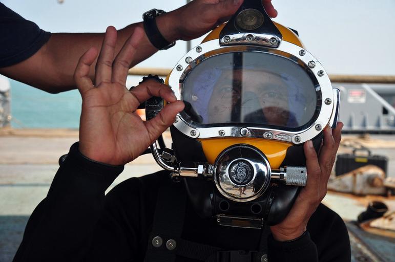 | Keywords: US Navy 090805-N-4220R-011 A Royal Brunei Navy diver signals after being fitted with a KM -37 dive helmet by members of U.S. Navy Mobile Diving and Salvage Unit (MDSU) 1 during training aboard the Navy Sealift Command rescue an.jpg  en MUARA Brunei Aug 5 2009 A Royal Brunei Navy diver signals after being fitted with a KM -37 dive helmet by members of U S Navy Mobile Diving and Salvage Unit MDSU 1 during training aboard the Navy Sealift Command rescue and salvage ship USNS Safeguard T-ARS 50 The training was part of Cooperation Afloat Readiness and Training CARAT Brunei 2009 a series of bilateral exercises held annually in Southeast Asia U S Navy photo by Chief Warrant Officer Troy Roat/Released 2009-08-05 090805-N-4220R-011 Navy http //www navy mil/view_image asp id 74897 U S Navy photo by Chief Warrant Officer Troy Roat PD-USGov-Military-Navy Aboard USNS Safeguard T-ARS-50 Lightweight demand diving helmets Navy of Brunei O gesture with thumb and forefinger Diving hand signals |