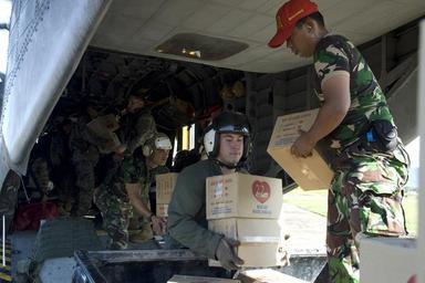 Keywords: US Navy 091009-N-9123L-074 Marine Cpl. Casey Hannan, a Meraux, La. native assigned to the Dragons of Marine Medium Helicopter Squadron (HMM) 265, and Indonesian Air Force personnel load a CH-53E Super Stallion helicopter.jpg en PADANG Indonesia Oct 9 2009 Marine Cpl Casey Hannan a Meraux La native assigned to the Dragons of Marine Medium Helicopter Squadron HMM 265 and Indonesian Air Force personnel load a CH-53E Super Stallion helicopter with relief supplies to be delivered to remote areas of west Sumatra Indonesia following two earthquakes Amphibious Force Seventh Fleet is directing the U S military response to a request from the Indonesian government for assistance and support for humanitarian efforts U S Navy photo by Mass Communication Specialist 2nd Class Byron C Linder/Released 2009-10-09 091009-N-9123L-074 Navy http //www navy mil/view_image asp id 76982 U S Navy photo by Mass Communication Specialist 2nd Class Byron C Linder PD-USGov-Military-Navy Images from US Navy location Padang Indonesia CH-53E US Marine Corps |