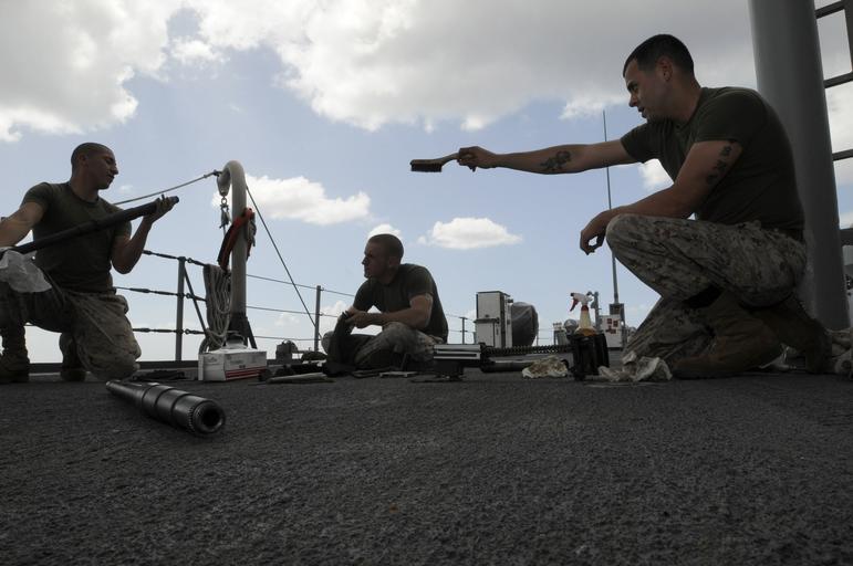 Keywords: US Navy 091009-N-3830J-034 Marines from Fleet Anti-terrorism Security Team Pacific Company, 5th Platoon, clean their weapons on the main deck of the amphibious command ship USS Blue Ridge (LCC 19).jpg en PACIFIC OCEAN Oct 9 2009 Marines from Fleet Anti-terrorism Security Team Pacific Company 5th Platoon clean their weapons on the main deck of the amphibious command ship USS Blue Ridge LCC 19 Blue Ridge is the flagship for Commander U S 7th Fleet U S Navy photo by Mass Communication Specialist 3rd Class Matthew D Jordan/Released 2009-10-09 091009-N-3830J-034 Navy http //www navy mil/view_image asp id 76995 U S Navy photo by Mass Communication Specialist 3rd Class Matthew D Jordan PD-USGov-Military-Navy Aboard USS Blue Ridge LCC-19 Gun cleaning Fleet Antiterrorism Security Team |