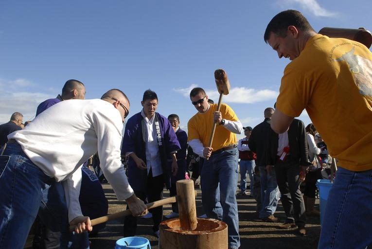 | Keywords: US Navy 091212-N-2218S-096 U.S. Navy chief petty officers and sailors from the Japan Maritime Self-Defense Force participate in Mochitsuki.jpg en YOKOSUKA Japan Dec 12 2009 U S Navy chief petty officers and sailors from the Japan Maritime Self-Defense Force JMSDF participate in Mochitsuki the traditional rice pounding ceremony The ceremony took place aboard the JMSDF Yokosuka base Mochi is a traditional Japanese food made by pounding cooked rice with wooden mallets U S Navy photo by Mass Communication Specialist 3rd Class Andrew Smith/Released 2009-12-12 091212-N-2218S-096 Navy http //www navy mil/view_image asp id 79303 U S Navy photo by Mass Communication Specialist 3rd Class Andrew Smith PD-USGov-Military-Navy Mochi pounding United States Fleet Activities Yokosuka |