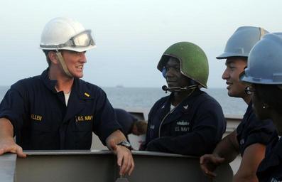 Keywords: US Navy 091226-N-1291E-108 Members of the deck department of the guided-missile cruiser USS Chosin (CG 65) speak aboard the ship as they depart Djibouti.jpg en DJIBOUTI Dec 26 2009 Members of the deck department of the guided-missile cruiser USS Chosin CG 65 speak aboard the ship as they depart Djibouti Chosin is the flagship for Combined Joint Task Force 151 a multinational task force established to conduct counter-piracy operations off the coast of Somalia U S Navy photo by Mass Communication Specialist 2nd Class Daniel Edgington/Released 2009-12-26 091226-N-1291E-108 Navy http //www navy mil/view_image asp id 79557 U S Navy photo by Mass Communication Specialist 2nd Class Daniel Edgington PD-USGov-Military-Navy Aboard USS Chosin CG-65 |