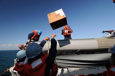 | Keywords: US Navy 100118-N-7923C-005 Hospital Corpsman 1st Class Robert Lemon, assigned to Maritime Civil Affairs Team (MCAT) 203, helps load food and medical supplies aboard a rigid hull inflatable boat.jpg en PORT-AU-PRINCE Haiti Jan 18 2010 Sailors aboard the amphibious dock landing ship USS Gunston Hall LSD 44 load food and medical supplies aboard a rigid hull inflatable boat aboard the amphibious dock landing ship USS Gunston Hall LSD 44 The supplies are bound for the Killick Haitian Coast Guard Base Gunston Hall arrived in Haiti Jan 18 to begin humanitarian relief operations as part of Operation Unified Response U S Navy photo by Lt j g Rick Chernitzer/Released 2010-01-18 100118-N-7923C-005 Navy http //www navy mil/view_image asp id 80150 U S Navy photo by Lt j g Rick Chernitzer PD-USGov-Military-Navy Aboard USS Gunston Hall LSD-44 |