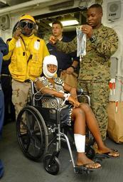 | Keywords: US Navy 100121-N-5345W-005 An injured Haitian woman waits for a medical transport to USNS Comfort (T-AH 20).jpg en BAIE DE GRAND GOAVE Haiti Jan 21 2010 An injured Haitian woman waits for a medical transport flight from the multi-purpose amphibious assault ship USS Bataan LHD 5 to the Military Sealift Command hospital ship USNS Comfort T-AH 20 after receiving initial treatment following a medical evacuation from the Haitian coast Bataan along with amphibious dock landing ships USS Fort McHenry LSD 43 USS Gunston Hall LSD 44 and USS Carter Hall LSD 50 are participating in Operation Unified Response and are providing military support capabilities to civil authorities to help stabilize and improve the situation in Haiti in the wake of the 7 0 magnitude earthquake on Jan 12 2010 U S Navy photo by Mass Communication Specialist 2nd Class Kristopher Wilson/Released 2010-01-21 100121-N-5345W-005 Navy http //www navy mil/view_image asp id 80482 U S Navy photo by Mass Communication Specialist 2nd Class Kristopher Wilson PD-USGov-Military-Navy Aboard USS Bataan LHD-5 Aboard USS Gunston Hall LSD-44 |