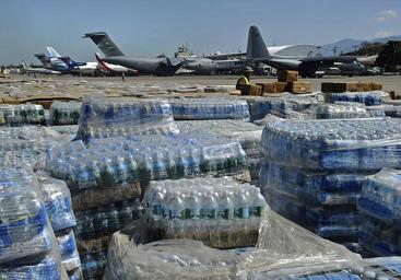 | Keywords: US Navy 100128-N-5345W-098 Pallets of humanitarian aid and bottled water are lined up in a staging area just off the tarmac of Aerodome de Jacmel, an airport in Port-au-Prince.jpg en PORT-AU-PRINCE Haiti Jan 28 2010 Pallets of humanitarian aid and bottled water are lined up in a staging area just off the tarmac of Aerodome de Jacmel an airport in Port-au-Prince while cargo planes from various nations sit at the airport's terminal facility The multi-purpose amphibious assault ship USS Bataan LHD 5 and the amphibious dock landing ships USS Fort McHenry LSD 43 USS Gunston Hall LSD 44 and USS Carter Hall LSD 50 are participating in Operation Unified Response as the Bataan Amphibious Relief Mission by providing military support capabilities to civil authorities to help stabilize and improve the situation in Haiti in the aftermath of a 7 0 magnitude earthquake on Jan 12 2010 U S Navy photo by Mass Communication Specialist 2nd Class Kristopher Wilson/Released 2010-01-28 100128-N-5345W-098 Navy http //www navy mil/view_image asp id 81036 U S Navy photo by Mass Communication Specialist 2nd Class Kristopher Wilson PD-USGov-Military-Navy Aboard USS Bataan LHD-5 Bottled water Aboard USS Gunston Hall LSD-44 |
