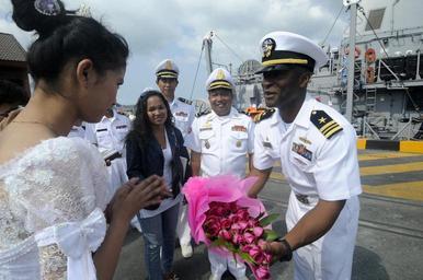 | Keywords: US Navy 100215-N-8335D-235 A Cambodian woman presents flowers to Lt. Cmdr. Walter Mainor.jpg  en SIHANOUKVILLE Cambodia Feb 15 2010 A Cambodian woman presents flowers to Lt Cmdr Walter Mainor commanding officer of the mine counter-measures ship USS Patriot MCM 7 after Patriot moored in Sihanoukville for a week-long port visit Patriot will conduct training with the Royal Cambodian Navy and participate in community service projects U S Navy photo by Mass Communication Specialist 1st Class Richard Doolin/Released 2010-02-15 100215-N-8335D-235 Navy http //www navy mil/view_image asp id 81985 U S Navy photo by Mass Communication Specialist 1st Class Richard Doolin PD-USGov-Military-Navy USS Patriot MCM-7  |
