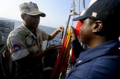 Keywords: US Navy 100218-N-8335D-232 Quartermaster 3rd Class Jeremy Moore shows Lt. Chum Horn the man overboard Oscar flag aboard USS Patriot (MCM 7).jpg en GULF OF THAILAND Feb 18 2010 Quartermaster 3rd Class Jeremy Moore shows Lt Chum Horn of the Royal Cambodian navy the man overboard Oscar flag aboard the mine counter-measures ship USS Patriot MCM 7 Patriot is on a five-month deployment and is visiting Cambodia to conduct training and participate in a community-service project U S Navy photo by Mass Communication Specialist 1st Class Richard Doolin/Released 2010-02-18 100218-N-8335D-232 Navy http //www navy mil/view_image asp id 82096 U S Navy photo by Mass Communication Specialist 1st Class Richard Doolin PD-USGov-Military-Navy USS Patriot MCM-7 Quartermaster United States Navy |