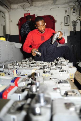 Keywords: US Navy 100219-N-6604E-118 Aviation Ordnanceman 3rd Class Michael Martin inspects aircraft equipment in the hangar bay of the aircraft carrier USS Dwight D. Eisenhower (CVN 69).jpg en GULF OF OMAN Feb 19 2010 Aviation Ordnanceman 3rd Class Michael Martin inspects aircraft equipment in the hangar bay of the aircraft carrier USS Dwight D Eisenhower CVN 69 Dwight D Eisenhower is on a six-month deployment as a part of the on-going rotation of forward-deployed forces U S Navy photo by Mass Communication Specialist 3rd Class Bradley Evans/Released 2010-02-19 100219-N-6604E-118 Navy http //www navy mil/view_image asp id 82207 U S Navy photo by Mass Communication Specialist 3rd Class Bradley Evans PD-USGov-Military-Navy Aboard USS Dwight D Eisenhower CVN-69 Aviation Ordnanceman Aircraft parts Sailors from the United States Navy Sitting men Males looking down |