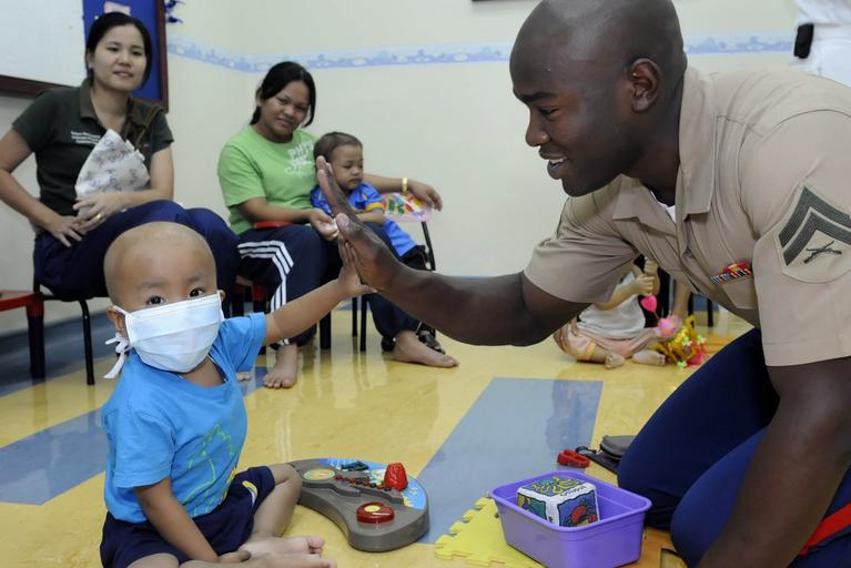Keywords: US Navy 100406-N-7478G-344 Cpl. Antwan Gibson high-fives a child in the Children's Ward at Hospital Likas during a community service project.jpg en KOTA KINABULU Malaysia April 6 2010 Cpl Antwan Gibson assigned to Fleet Antiterrorism Security Team 1st Company embarked aboard the U S 7th Fleet command ship USS Blue Ridge LCC 19 high-fives a child in the Children's Ward at Hospital Likas during a community service project Blue Ridge is in Kota Kinabalu for a scheduled port visit U S Navy photo by Mass Communication Specialist 2nd Class Cynthia Griggs/Released 2010-04-06 100406-N-7478G-344 Navy http //www navy mil/view_image asp id 84105 U S Navy photo by Mass Communication Specialist 2nd Class Cynthia Griggs PD-USGov-Military-Navy Aboard USS Blue Ridge LCC-19 Fleet Antiterrorism Security Team |