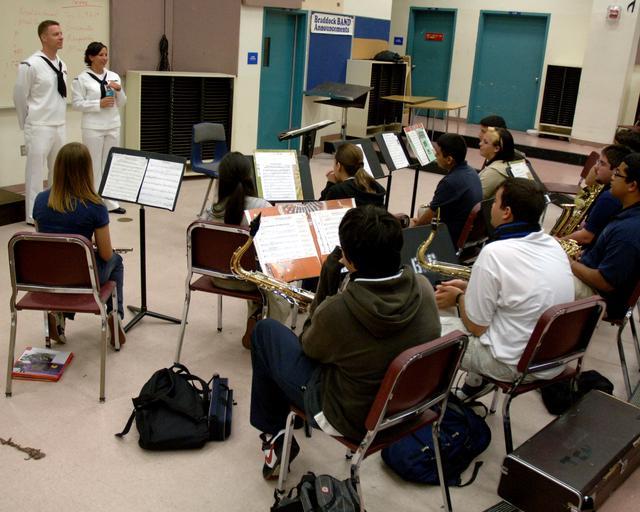 | Keywords: US Navy 100427-N-4716P-042 Musician Seaman Brooke Knight and Musician 3rd Class Gene Register speak to the G. Holmes Braddock Senior High School band about careers in the Navy's music program during Fleet Week Port Everglades.jpg en MIAMI Fla April 27 2010 Musician Seaman Brooke Knight a singer and Musician 3rd Class Gene Register a keyboardist both members of the U S Navy Band Southeast contemporary ensemble Pride speak to the G Holmes Braddock Senior High School band about careers in the Navy's music program during Fleet Week Port Everglades This is the twentieth Fleet Week Port Everglades South Florida's annual celebration of the maritime services More than 2 500 American and German sailors marines and coast guardsmen will participate in a number of community outreach activities and enjoy the hospitality and tourism of South Florida U S Navy photo by Chief Mass Communication Specialist Gabe Puello/Released 2010-04-27 100427-N-4716P-042 Navy http //www navy mil/view_image asp id 84813 U S Navy photo by Chief Mass Communication Specialist Gabe Puello PD-USGov-Military-Navy Images from US Navy location Miami Fla Musician United States Navy Fleet Week Port Everglades Military people of the United States with children |