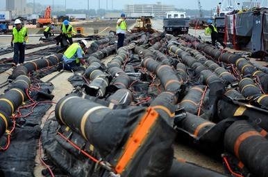 Keywords: US Navy 100430-N-7367K-006 Longshoremen and personnel assigned to the Supervisor of Salvage and Diving division of Naval Sea Systems Command stage oil containment booms.jpg en GULFPORT Miss April 30 2010 Longshoremen and personnel assigned to the Supervisor of Salvage and Diving division of Naval Sea Systems Command stage oil containment booms The Supervisor of Salvage and Diving division has sent 66 000 feet of inflatable oil booms skimming systems related support equipment and personnel to support clean-up efforts for the Deepwater Horizon oil spill Deepwater Horizon was an ultra-deepwater oil rig that sank April 22 causing a massive oil spill threatening the U S Gulf Coast U S Navy photo by Mass Communication Specialist 1st Class Demetrius Kennon/Released 2010-04-30 100430-N-7367K-006 Navy http //www navy mil/view_image asp id 84880 U S Navy photo by Mass Communication Specialist 1st Class Demetrius Kennon PD-USGov-Military-Navy Images from US Navy location Gulfport Miss Oil containment booms Dock workers Dockwork |