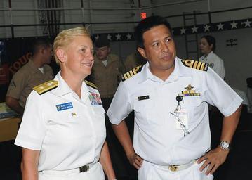 | Keywords: US Navy 100510-N-8377A-040 Rear Adm. Nora Tyson and Col. Abdul Halim attend a reception aboard the amphibious dock landing ship USS Tortuga (LSD 46).jpg en MUARA Brunei May 10 2010 Rear Adm Nora Tyson commander of Logistics Group Western Pacific and Col Abdul Halim commander of the Royal Brunei Navy attend a reception aboard the amphibious dock landing ship USS Tortuga LSD 46 following the closing ceremony for Cooperation Afloat Readiness and Training CARAT Brunei 2010 CARAT is a series of bilateral exercises held annually in Southeast Asia to strengthen relationships and enhance force readiness U S Navy photo by Chief Mass Communication Specialist Michael Ard/Released 2010-05-10 100510-N-8377A-040 Navy http //www navy mil/view_image asp id 85295 U S Navy photo by Chief Mass Communication Specialist Michael Ard PD-USGov-Military-Navy Aboard USS Tortuga LSD-46 Cooperation Afloat Readiness and Training 2010 Nora Tyson |
