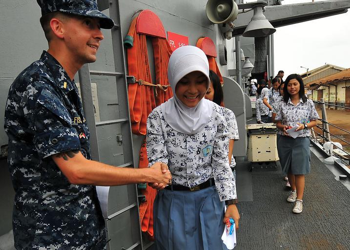| Keywords: US Navy 100527-N-7643B-206 Ensign Jason Fischer thanks an Indonesian high school student for coming aboard the guided-missile frigate USS Vandegrift (FFG 48) for a tour of the ship.jpg  en SURABAYA Indonesia May 27 2010 Ensign Jason Fischer thanks an Indonesian high school student for coming aboard the guided-missile frigate USS Vandegrift FFG 48 for a tour of the ship Sailors from Vandegrift gave a tour of their ship to local high school students as part of Naval Engagement Activity Indonesia 2010 Naval Engagement Activity is part of the Cooperation Afloat Readiness and Training CARAT series of bilateral exercises held annually in Southeast Asia to strengthen relationships and enhance force readiness U S Navy photo by Mass Communication Specialist 2nd Class David A Brandenburg/Released U S Navy photo by Mass Communication Specialist 2nd Class David A Brandenburg/Released 2010-05-27 100527-N-7643B-206 Navy http //www navy mil/view_image asp id 86095 U S Navy photo by Mass Communication Specialist 2nd Class David A Brandenburg PD-USGov-Military-Navy USS Vandegrift FFG-48 Cooperation Afloat Readiness and Training 2010 |