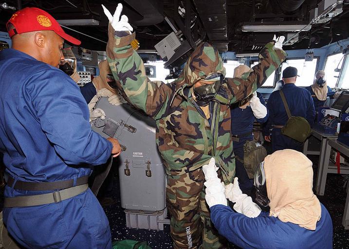 | Keywords: US Navy 100602-N-1082Z-022 Sailors don full protective gear during a simulated chemical, biological and radiological attack.jpg  en U S 5TH FLEET AREA OF RESPONSIBILITY June 2 2010 Navy Counselor 1st Class Marquez Bell left from Los Angeles and Quartermaster 1st Class Jeffery Goforth from Elyria Ohio help Operations Specialist Seaman John McNulty from North Brunswick N J to properly dress in full protective gear during a simulated chemical biological and radiological attack aboard the amphibious dock landing ship USS Ashland LSD 48 Ashland is part of the Nassau Amphibious Ready Group supporting maritime security operations and theater security cooperation efforts U S Navy photo by Mass Communication Specialist 2nd Class Jason R Zalasky/Released 2010-06-02 100602-N-1082Z-022 Navy http //www navy mil/view_image asp id 86550 U S Navy photo by Mass Communication Specialist 2nd Class Jason R Zalasky PD-USGov-Military-Navy Aboard USS Ashland LSD-48  |
