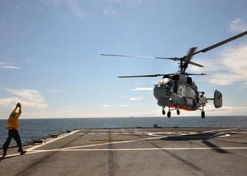 | Keywords: US Navy 100722-N-1098L-030 Ka-27PS above USS Mount Whitney (LCC-JCC 20) - 2010.jpg en English Channel July 22 2010 Military Sealift Fleet Support Command MSC civil service mariner Boatswain's Mate Anthony Brooks a landing signal enlisted flight crewmen directs a Kamov <s> KA 26 Helix Soviet navy</s> Ka-27PS Russian Navy helicopter for takeoff aboard the amphibious command ship USS Mount Whitney LCC/JCC 20 as part of an international partnership training during FRUKUS 2010 FRUKUS is an annual naval exercise involving the maritime forces of France Russia the United Kingdom and the United States developed to formulate joint activities within a multi-national operational formation while improving interoperability between the nations U S Navy photo by Chief Warrant Officer Jeffrey Lund/Released 2010-07-22 100722-N-1098L-030 Navy http //www navy mil/view_image asp id 89219 U S Navy photo by Chief Warrant Officer Jeffrey Lund PD-USGov-Military-Navy Kamov Ka-27 Aboard USS Mount Whitney LCC-20 |