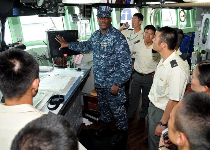 Keywords: US Navy 100812-N-8113T-086 Lt. Bobby Jone describes the duties and responsibilities of the bridge watch team from the pilot house to a group of Japan Ground Self-Defense Force soldiers.jpg en YOKOSUKA Japan Aug 12 2010 Lt Bobby Jones from Atlanta a weapons officer aboard the Arleigh Burke-class guided-missile destroyer USS Stethem DDG 63 describes the duties and responsibilities of the bridge watch team from the pilot house to a group of Japan Ground Self-Defense Force JGSDF soldiers during a cooperative work program shipboard tour The work program is a partnership between the U S Army and JGSDF that blends a group of JGSDF service members into various commands at Camp Zama at U S Army Garrison Japan to practice English and learn about U S military structure U S Navy photo by Mass Communication Specialist 1st Class N Ross Taylor/Released 2010-08-12 100812-N-8113T-086 Navy http //www navy mil/view_image asp id 90208 U S Navy photo by Mass Communication Specialist 1st Class N Ross Taylor PD-USGov-Military-Navy Aboard USS Stethem DDG-63 |