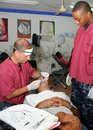 Keywords: US Navy 100814-N-3265K-013 Cmdr. Scott Thomas, a dental officer, and Hospitalman Rashad Thompson, both assigned to the multi-purpose amphibious assault ship USS Iwo Jima (LHD 7).jpg en COVENAS Colombia Aug 14 2010 Cmdr Scott Thomas a dental officer and Hospitalman Rashad Thompson both assigned to the multi-purpose amphibious assault ship USS Iwo Jima LHD 7 perform dental work on a Colombian man at the Continuing Promise medical site Escuela Ismael Contreas Iwo Jima is operating off the coast of Colombia supporting the Continuing Promise 2010 humanitarian civic assistance mission The assigned medical and engineering staff embarked aboard Iwo Jima are working with partner nation teams to provide medical dental veterinary and engineering assistance to several different nations U S Navy photo by Mass Communication Specialist 3rd Class Travis J Kuykendall/Released 2010-08-14 100814-N-3265K-013 Navy http //www navy mil/view_image asp id 90356 U S Navy photo by Mass Communication Specialist 3rd Class Travis J Kuykendall PD-USGov-Military-Navy Aboard USS Iwo Jima LHD-7 |