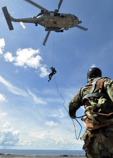 | Keywords: US Navy 100822-N-2013O-210 Navy Diver 2nd Class Brody Dorton rappels from an HH-60H Sea Hawk helicopter.jpg en PACIFIC OCEAN Aug 22 2010 Navy Diver 2nd Class Brody Dorton from Blainsville Ga assigned to platoon 522of Explosive Ordnance Disposal Mobile Unit EODMU 5 rappels from an HH-60H Sea Hawk helicopter assigned to the Chargers of Helicopter Anti-Submarine Squadron HS 14 onto the aircraft carrier USS George Washington CVN 73 during helicopter rope suspension technique training George Washington the Navy's only permanently forward-deployed aircraft carrier is underway helping to ensure security and stability in the western Pacific Ocean U S Navy photo by Mass Communication Specialist 3rd Class Charles Oki/Released 2010-08-22 100822-N-2013O-210 Navy http //www navy mil/view_image asp id 90748 U S Navy photo by Mass Communication Specialist 3rd Class Charles Oki PD-USGov-Military-Navy Aboard USS George Washington CVN-73 United States Navy Divers Abseiling from helicopters |