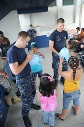 | Keywords: US Navy 100822-N-9964S-236 Hospital Corpsman 3rd Class Josh Whoolery and Hospital Corpsman Dana Scott turn rubber gloves into balloons for a Costa Rican boy during a Pacific Partnership 2010 community service event.jpg  en LIMON Costa Rica Aug 22 2010 Hospital Corpsman 3rd Class Josh Whoolery and Hospital Corpsman Dana Scott turn rubber gloves into balloons for a Costa Rican boy during a Pacific Partnership 2010 community service event The multipurpose amphibious assault ship USS Iwo Jima LHD 7 is on a port visit to Limon conducting the Continuing Promise 2010 humanitarian civic assistance mission The assigned medical and engineering staff embarked aboard Iwo Jima will work with partner nation teams to provide medical dental veterinary and engineering assistance in eight different nations U S Navy photo by Mass Communication Specialist 1st Class Christopher B Stoltz/Released 2010-08-22 100822-N-9964S-236 Navy http //www navy mil/view_image asp id 90675 U S Navy photo by Mass Communication Specialist 1st Class Christopher B Stoltz PD-USGov-Military-Navy Aboard USS Iwo Jima LHD-7 Hospital Corpsman |