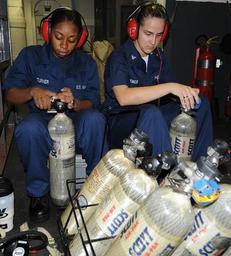 Keywords: US Navy 100823-N-6427M-004 lectronics Technician Fireman Shanina Turner and Electronics Technician 3rd Class Ashley Jones refill self-contained breathing apparatus tanks aboard the aircraft USS Harry S. Truman (CVN 75).jpg en ARABIAN SEA Aug 23 2010 Electronics Technician Fireman Shanina Turner and Electronics Technician 3rd Class Ashley Jones refill self-contained breathing apparatus tanks aboard the aircraft USS Harry S Truman CVN 75 The Harry S Truman Carrier Strike Group is deployed supporting maritime security operations and theater security cooperation efforts in the U S 5th Fleet area of responsibility U S Navy photo by Mass Communication Specialist Seaman Ryan McLearnon/Released 2010-08-23 100823-N-6427M-004 Navy http //www navy mil/view_image asp id 90843 U S Navy photo by Mass Communication Specialist Seaman Ryan McLearnon PD-USGov-Military-Navy Aboard USS Harry S Truman CVN-75 Self-contained breathing apparatus Women in the United States Navy |