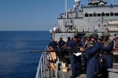 | Keywords: US Navy 100830-N-7293M-022 Gunnerâ^euro,^trade,s Mate 2nd Class Joshua Leech demonstrates the operation of a .50-caliber machine gun during weapons training aboard SS Ponce (LPD 15).jpg en ATLANTIC OCEAN Aug 30 2010 Gunnerâ s Mate 2nd Class Joshua Leech demonstrates the operation of a 50-caliber machine gun during weapons training on the foc'sle of the amphibious transport dock USS Ponce LPD 15 as the ship transits the Atlantic Ocean after deploying from Norfolk Va Aug 27 Ponce is part of the Kearsarge Amphibious Readiness Group KSG ARG supplying food water and heavy-lift equipment in support of the humanitarian relief efforts for flood victims in Pakistan U S Navy photo by Mass Communication Specialist 1st Class Nathanael Miller/Released 2010-08-30 100830-N-7293M-022 Navy http //www navy mil/view_image asp id 91062 U S Navy photo by Mass Communication Specialist 1st Class Nathanael Miller PD-USGov-Military-Navy Aboard USS Ponce LPD-15 |