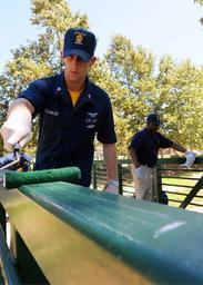 Keywords: US Navy 100901-N-1004S-493 Chief Aviation Electronics Technician (Sel.) Justin Franklin, assigned to the aircraft carrier USS Ronald Reagan (CVN 76), paints the hand rail of a foot bridge at the Ronald Reagan Sports Park.jpg en TEMECULA Calif Sept 1 2010 Chief Aviation Electronics Technician Sel Justin Franklin assigned to the aircraft carrier USS Ronald Reagan CVN 76 paints the hand rail of a foot bridge at the Ronald Reagan Sports Park during a community service event in conjunction with the 7th annual San Diego CPO Pride Day More than 70 Ronald Reagan chiefs and chief selects participated in the day's events which began at the USS Midway Museum and continued with community service activities across the San Diego County area Ronald Reagan is at homeport in San Diego U S Navy photo by Mass Communication Specialist 3rd Class Shawn J Stewart/Released 2010-09-01 100901-N-1004S-493 Navy http //www navy mil/view_image asp id 91342 U S Navy photo by Mass Communication Specialist 3rd Class Shawn J Stewart PD-USGov-Military-Navy Aboard USS Ronald Reagan CVN-76 |