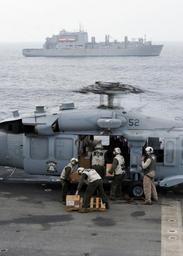Keywords: US Navy 100906-N-1485C-341 Marines load humanitarian assistance disaster relief supplies onto an MH-60S Sea Hawk helicopter aboard USS Peleliu (LHA 5).jpg en ARABIAN SEA Sept 6 2010 Marines assigned to Combat Cargo load humanitarian assistance disaster relief supplies onto an MH-60S Sea Hawk helicopter aboard the amphibious assault ship USS Peleliu LHA 5 as the Military Sealift Command dry cargo and ammunition ship USNS Lewis and Clark T-AKE 1 cruises off the ship's portside Peleliu is sending an initial 80 pallets of supplies to Sharea Faisal Air Base for further distribution to flood regions supporting the Pakistani government and military disaster relief operations in Pakistan U S Navy photo by Mass Communication Specialist 3rd Class Ian Campbell/Released 2010-09-06 100906-N-1485C-341 Navy http //www navy mil/view_image asp id 91321 U S Navy photo by Mass Communication Specialist 3rd Class Ian Campbell PD-USGov-Military-Navy Aboard USS Peleliu LHA-5 2010 Pakistan flood relief efforts |